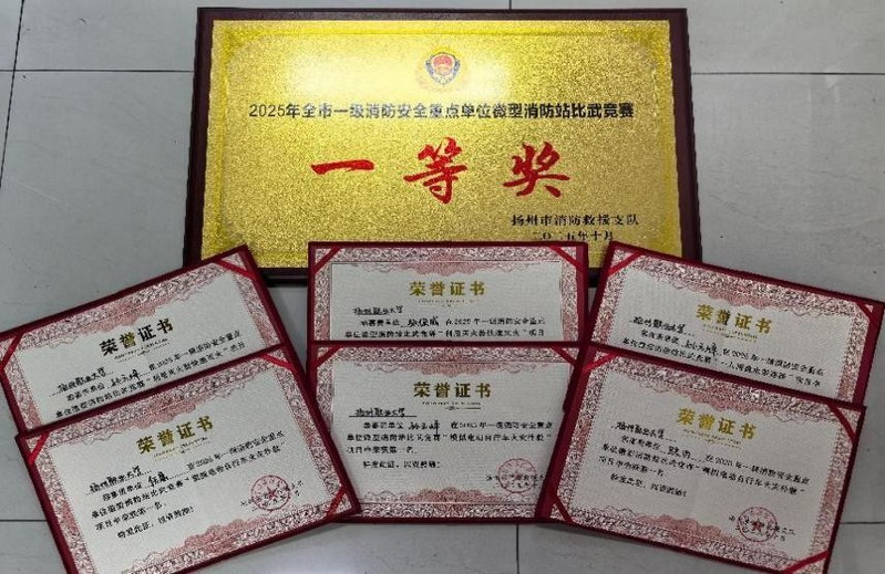 10月23日,由扬州市消防救援支队主办的2025年一级消防安全重点单位微型消防站比武竞赛在扬州大学拉开帷幕,来自全市的20支参赛队伍同台竞技,我校代表队凭借扎实的专业功底与出色的实战表现,最终斩获总分第一名的优异成绩。